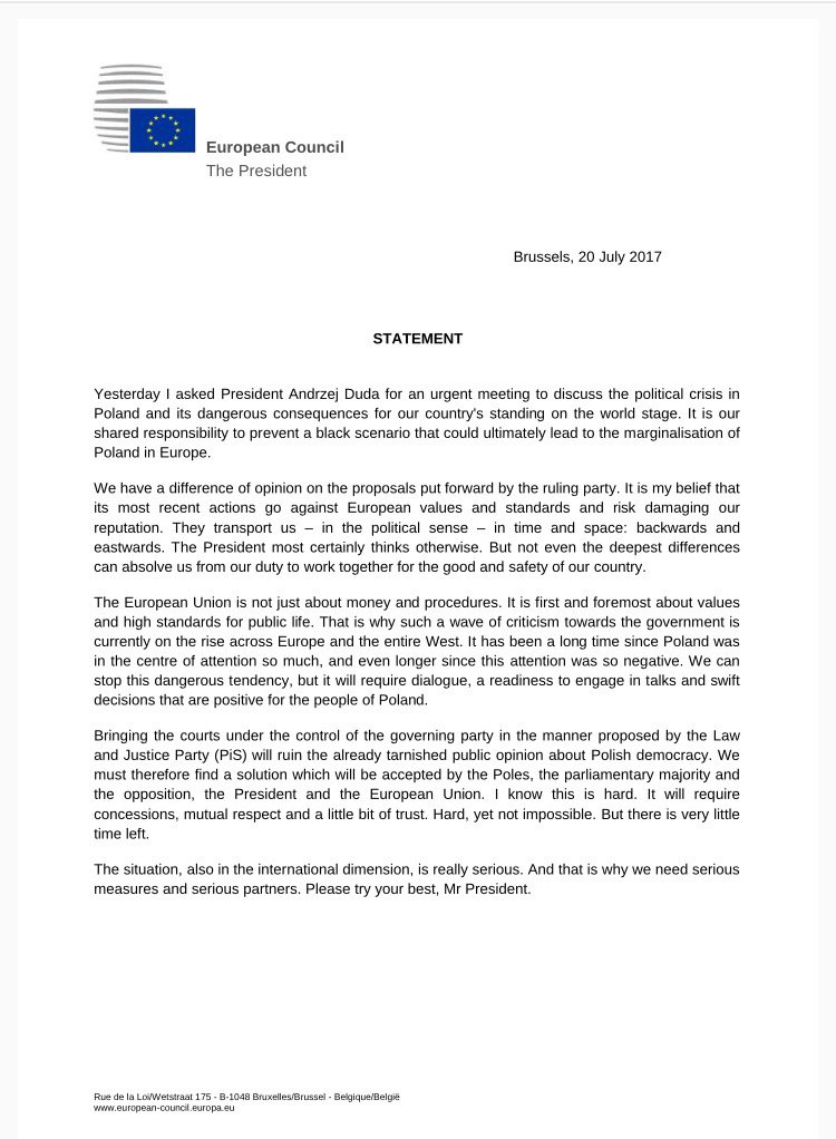 Concern remains that this may be only a short-term, tactical, retreat and the government may yet come back with slightly amended proposals that achieve their desired outcome – complete control of the courts and judiciary. But even so, this represents a major setback for the PiS and most of the credit must go to the hundreds of thousands of demonstrators who held eight days of demonstrations against the proposed legislation. But the strong line taken by then EU undoubtedly also played a part, with a threat to strip Poland of its voting rights within the EU, and a warning from Donald Tusk that the proposals would lead to a “black scenario that could ultimately lead to the marginalisation of Poland in Europe” in this statement: